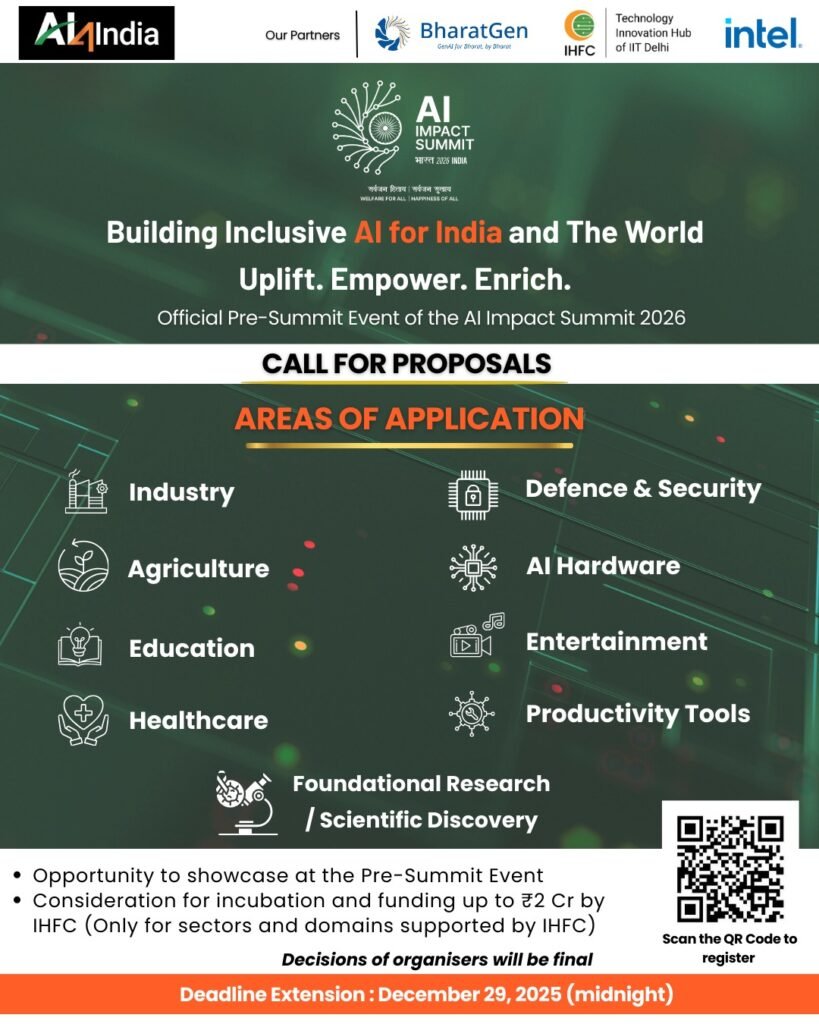 We’re inviting innovative AI startups and research teams to submit proposals across key sectors — from education, healthcare and governance to agriculture, industry, defence, entertainment and foundational research.