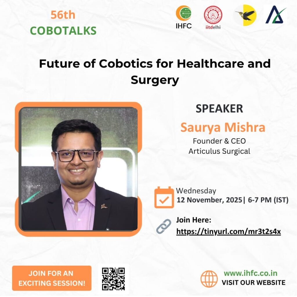 We are delighted to bring to you the 56th edition of Cobotalks, our monthly seminar series, featuring IHFC incubated start up Articulus Surgical and their CEO Saurya Mishra.